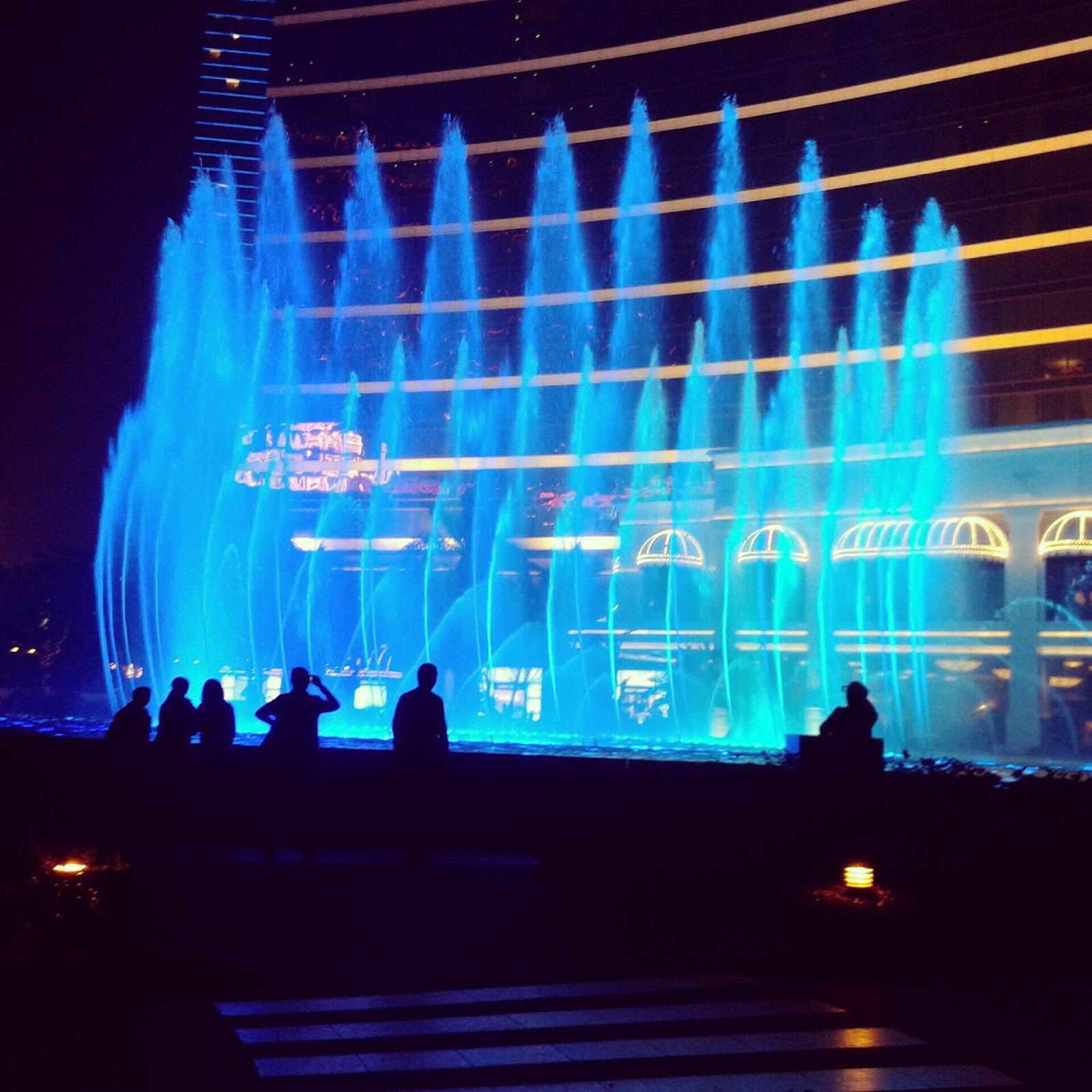 Pertama-tama kami sampai di jotel Wynn, disitu ada light fountain orchestra yang lebih dasyat daripada yang di MBS Singapore. Orkestra berupa air mancur menari-nari diiringi pencahayaan yang spektakuler dan musik jazz ini muncul mulai jam 8 malam setiap 15 menit sekali di depan lobi hotel Wynn. Habis orkestra selesai , kami coba masuk ke lobi hotel Wynn, tadinya sih saya nggak mau. That place was very vulgar, maksud saya keglamorannya ya. Tapi partner saya, Dewi kayaknya tertarik buat masuk, ya sudah, saya ikutan. Kesan saya setelah masuk Wynn; Ini hotel apa department store?? Semua toko bermerk Italia dan Eropa ada disini semua. Setelah puas lihat-lihat Wynn kami jalan ke arah Grand Lisboa dan pulang ke hotel naik bus buat mengistirahatkan badan.