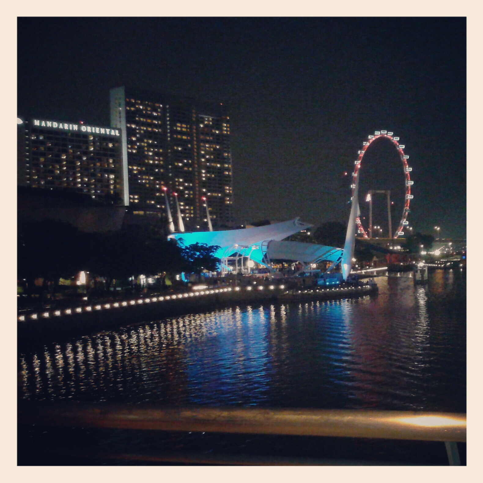 Dari Orchard, melalui stasiun MRT Somerset, kami meluncur ke Raffles Place untuk selanjutnya jalan ke tiga ikon besar Singapura: Esplanade, Marina Bay Sands dan Patung Merlion. Esplanade merupakan gedung pertunjukan Singapura dengan arsitektur mirip dua kulit durian yang ditelungkupkan, setiap malam banyak pertunjukan seni yang diadakan disini. Pada malam disaat saya datang, sayup terdengar bunyi gamelan dipadu dengan orchestra modern lainnya seperti drum, bass dan gitar melodi. Benar saja, ternyata di luar Esplanade sedang ada pertunjukan gamelan modern yang dikemas dengan sangat luar biasa. Saya sebagai orang Indonesia ikut merinding melihat dan mendengar apresiasi penonton yang luar biasa saat itu. Di sela pertunjukan gamelan, saya pun ditakjubkan oleh pemandangan yang lain; pertunjukan light orchestra dari atas gedung Marina Bay Sands yang fantastik. Pada pertunjukan ini lampu laser berbagai warna dimainkan hingga dapat memantul hingga jarak jauh disertai music orchestra yang mengiringi. Puas melihat pertunjukan dan foto-foto di kawasan tersebut kami pun pulang kembali ke hostel dengan MRT dari Raffles ke Lavender.
