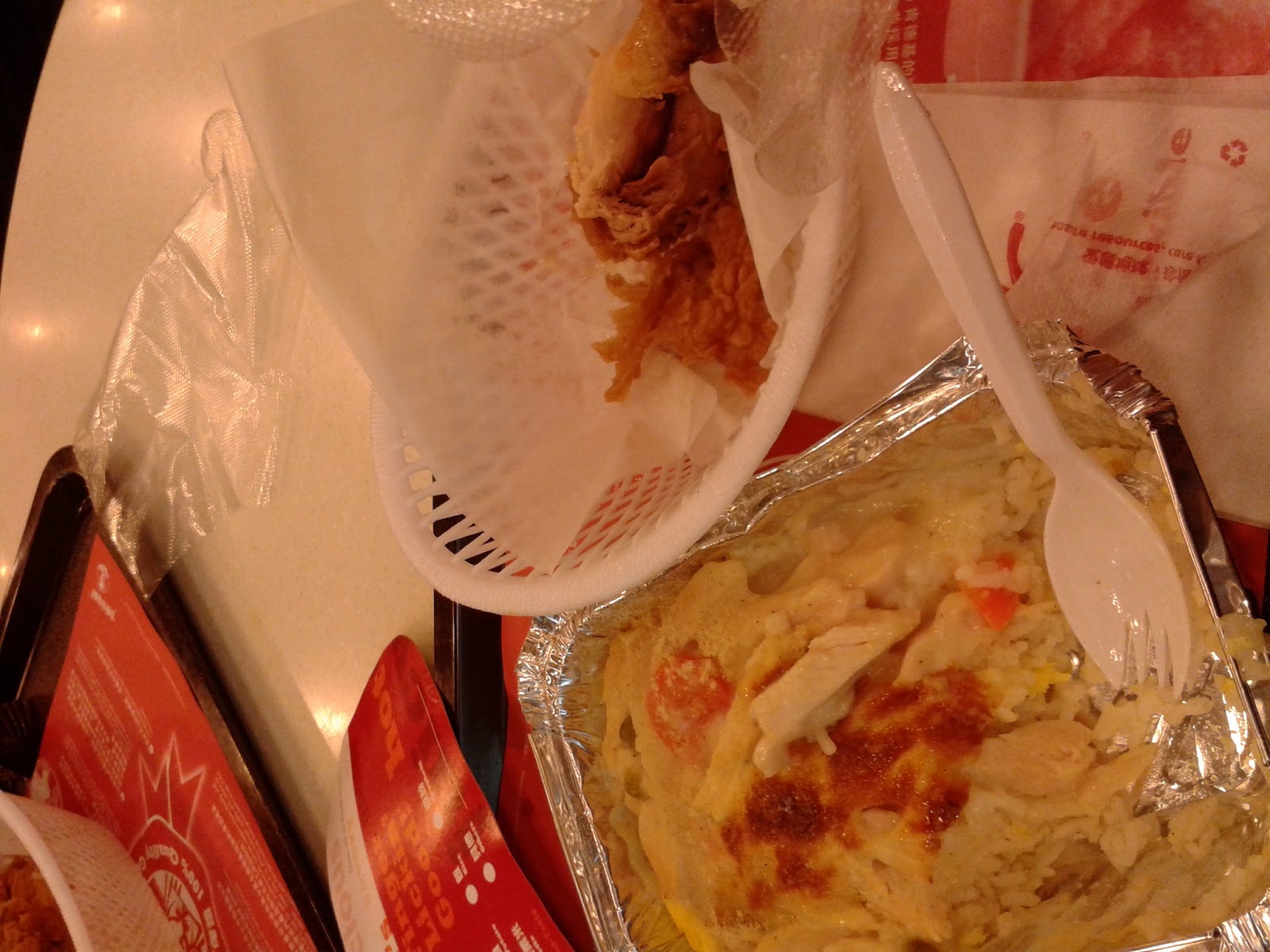 Kami akhirnya sampai di KFC dengan selamat bin kedinginan, dan ternyata di KFC ini seabrek isinya orang Indonesia semua. Saya pesan Baked Rice seharga 30 HKD dan ternyata saya yang porsi makannya besar ini merasa porsi itu besar banget sampe ga habis, tahu gini kami pesan satu saja buat dua orang. Baked Rice ini seperti nasi panggang yang dilengkapi dengan kaldu, telur dan ayam, masih ditambahin paha ayam goreng yang gedenya ngauzubilah. Orang Cina porsi makannya gede juga ternyata, tapi kenapa mereka ga obes?? Hik hik�
